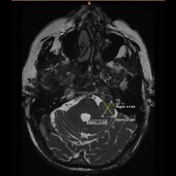 W dn. 15.09.2021 do Poradni Radioterapii zgłosił się chory z niedosłuchem lewostronnym i zaburzeniami równowagi. W wyniku MRI głowy w lewym kącie mostowo-móżdżkowym widoczna była lita masa silnie wzmacniającego się guza, który cienką wypustką wpuklał się do światła przewodu słuchowego wew.