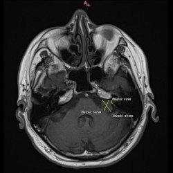 W dn. 15.09.2021 do Poradni Radioterapii zgłosił się chory z niedosłuchem lewostronnym i zaburzeniami równowagi. W wyniku MRI głowy w lewym kącie mostowo-móżdżkowym widoczna była lita masa silnie wzmacniającego się guza, który cienką wypustką wpuklał się do światła przewodu słuchowego wew.